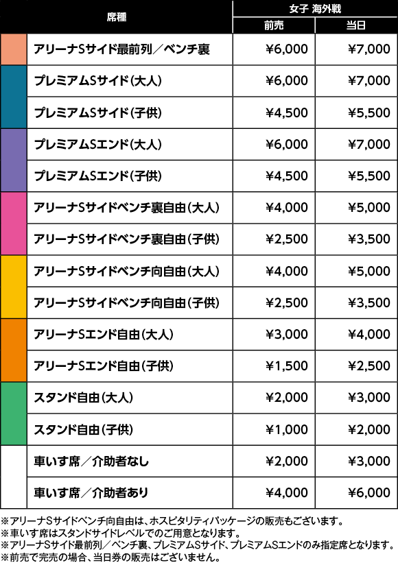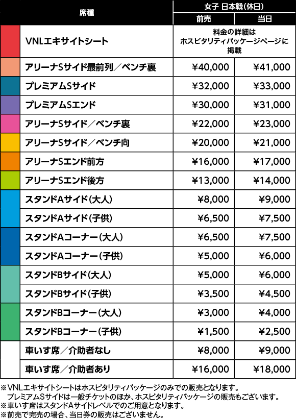 ・ 車いす席介助者の方は、車いすご利用のお客様と同時入場が必要です。介助者の方が2名以上の場合は、チケット購入前にhttps://www.jva.or.jp/faq/から問合せください。車いす席は一般発売からの販売となります。