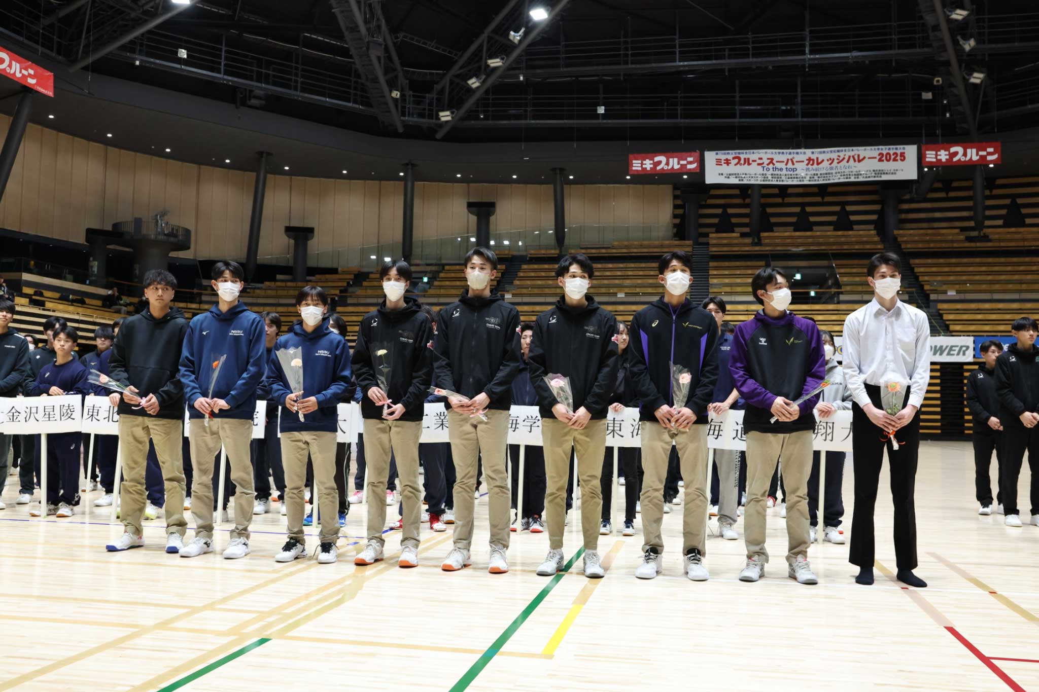 開会式ではまず、今年度の国際大会に出場した選手を表彰しました。ドイツで行われたFISUワールドユニバーシティゲームズ(2025/ライン・ルール)で、女子は銀メダルを獲得し、男子は4位に入賞。さらにインドネシアで行われた2025女子U21世界選手権大会でも準優勝と、世界の舞台で結果を残しました。今年から就任した一般財団法人全日本大学バレーボール連盟の積山和明会長は「ここに集まった皆さんは、世界に通用する選手であると感じております。ぜひ、そのことを誇りに思って、この大会に臨んでほしい」とエールを送りました。