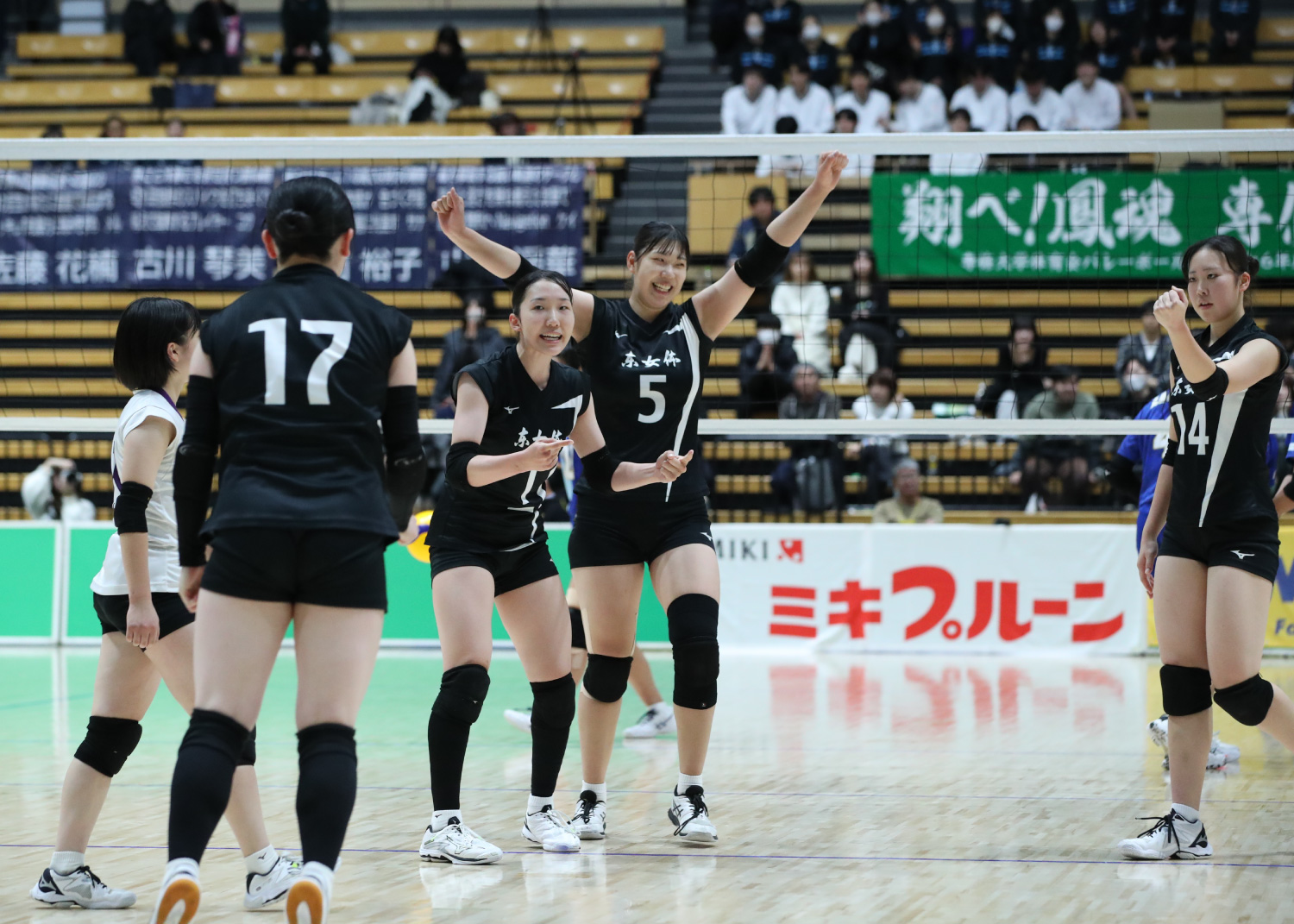 女子決勝は関東大学1部リーグ戦で春、秋と優勝した東京女子体育大学と、西日本インカレを制した鹿屋体育大学のカードとなりました。第1セットは鹿屋体育大学が、佐藤花楠選手のブロックなどで立ち上がりから6連続得点。山下遥華キャプテンや天野恋選手のスパイクでさらに点差を広げると、激しい追い上げをかわしてセットを先取します。第2セットは16-14と東京女子体育大学がリードした場面で渡邊彩美選手のサービスエースが決まり、勢いに乗ってセットを取り返します。東京女子体育大学は第3セット以降も佐藤彩夏選手や酒井夏菜選手の得点で主導権を握り続け、最後は小園瞳選手がブロックを決め3-1(23-25、25-19、25-19、25-17)で勝利。55年ぶり2度目の日本一をつかみました。