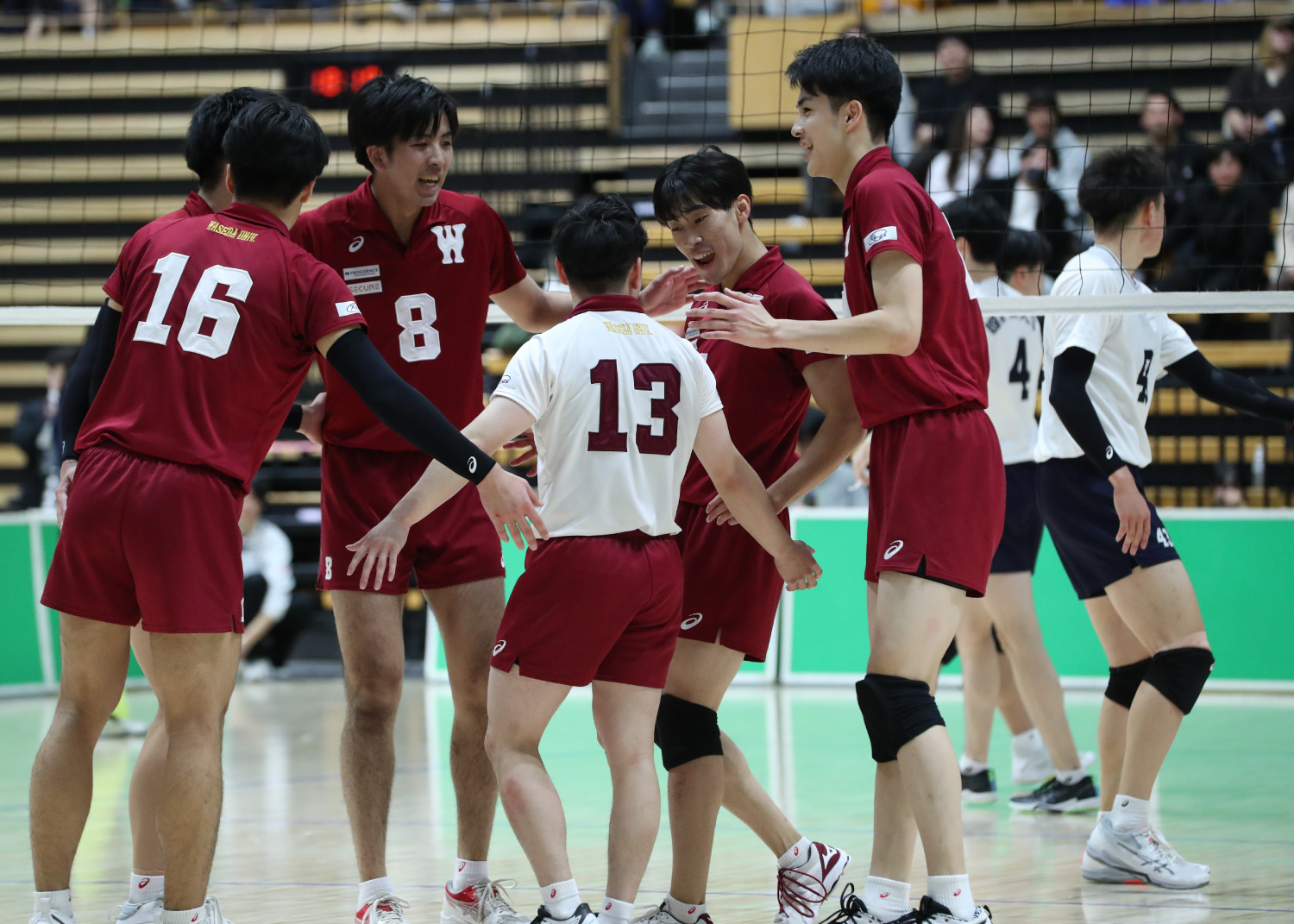 男子決勝は2年ぶりの日本一を狙う早稲田大学と、初めて決勝に進出した国士舘大学が対戦しました。第1セットは、初めての大舞台に燃える国士舘大学が、工藤築主将や定山蒼昊選手のスパイクなどで主導権を握ります。しかし早稲田大学はローゼンマーク有廉ジュニア選手や小野駿太選手のブロックで流れをつかむと、川野琢磨選手のスパイクで逆転に成功し、最後も小野選手のバックアタックでセットを先取します。続く第2セットも小野選手や川野選手、途中出場の德留巧大選手らが得点を重ねてセットを連取。あとがない国士舘大学はセッターの竹松魁柊選手を軸に攻撃を組み立てますが、強固な守備で追い上げを許さなかった早稲田大学が3-0(25-20、25-18、25-20)で勝利し、王座奪還を果たしました。