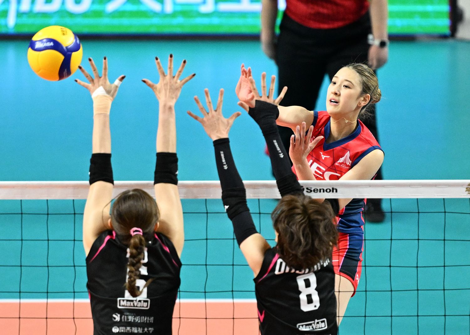 女子の第1試合、5大会ぶり2度目の皇后杯優勝を目指す大阪マーヴェラス対初優勝を目指す埼玉上尾メディックスの戦いは、第1セット、大阪マーヴェラスはリードを許しますが、宮部愛芽世選手、田中瑞稀選手の活躍で逆転に成功しこのセットを取ると、第2、第3セットも連取し、セットカウント3-0(25-23、25-16、25-18)のストレートで決勝進出を決めました。準決勝のもう1試合は連覇を目指すヴィクトリーナ姫路対2大会ぶり3度目の優勝を目指すNECレッドロケッツ川崎の対戦。第1セット、一進一退で終盤を迎えるとNECレッドロケッツ川崎は山田二千華選手のブロックが決まり第1セットを取ります。その後佐藤淑乃選手のスパイクなどで得点を重ね、セットカウント3-0(25-22、25-19、25-17)のストレート勝ちで、決勝進出を決めました。決勝は大阪マーヴェラス対NECレッドロケッツ川崎の対戦となりました。