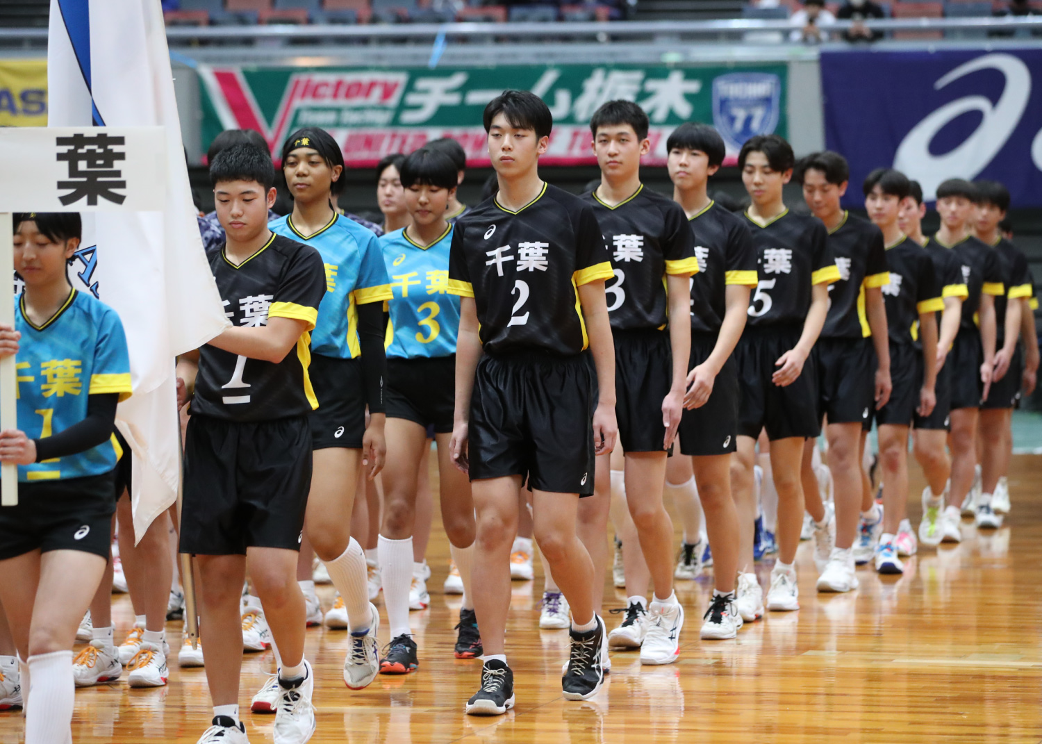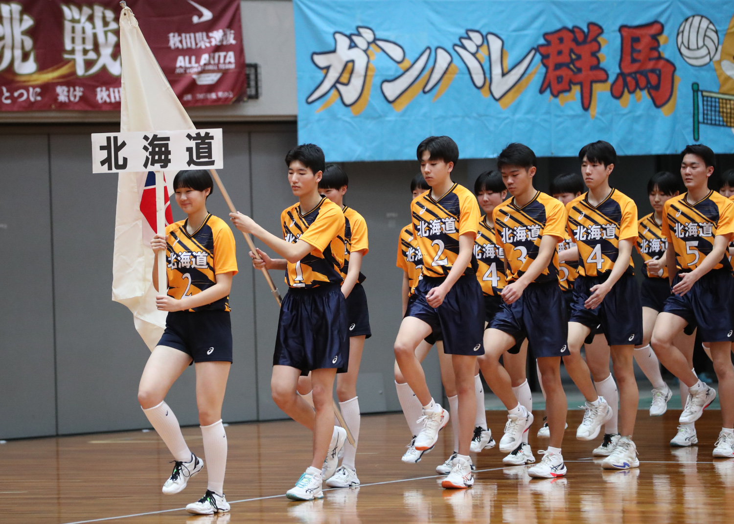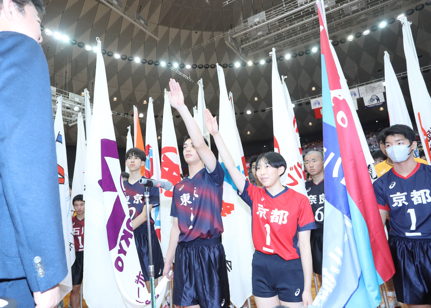 選手宣誓は前回大会優勝チームの男女キャプテンが務め、東京都男子代表の草薙羅云選手と京都府女子代表の桝谷栞愛選手が「私たちは、バレーボールが大好きな気持ちとここまで続けてこられた感謝の気持ちを胸に、今日このコートに立っています。毎日の練習でうまくいかないことや苦しいこともありましたが、仲間と声をかけ合い、一歩ずつ成長してきました。支えてくれた家族、指導してくださった先生やコーチ、そして大会を開いてくださった多くの方々への感謝を忘れずにプレーすることを誓います」と宣言しました。