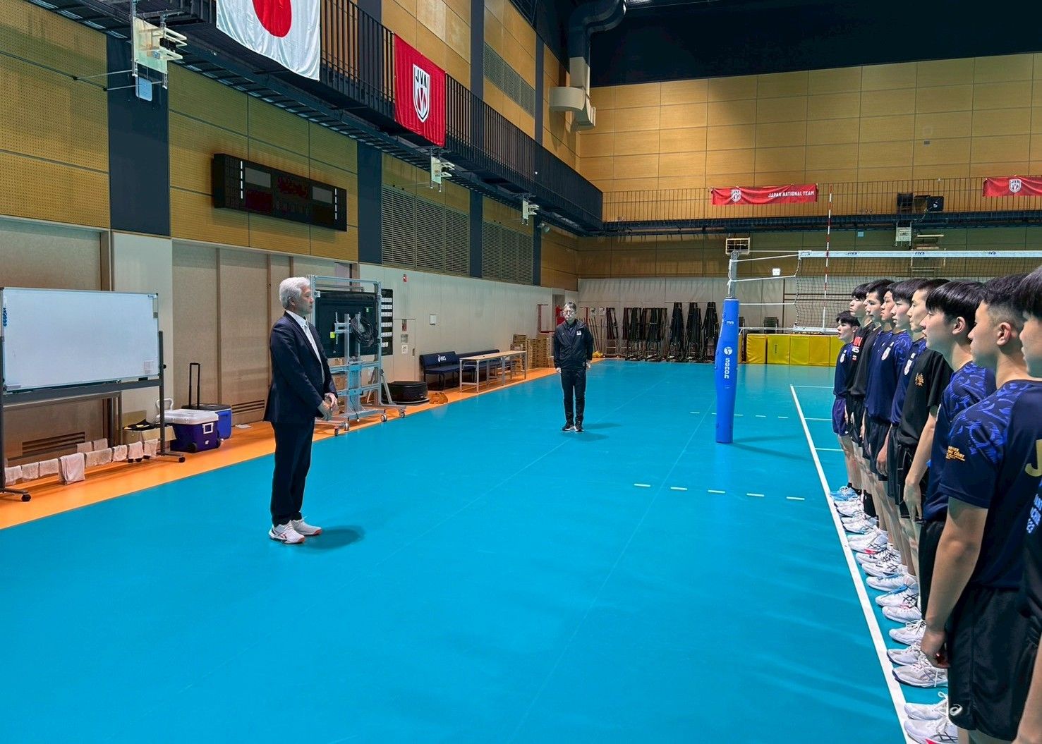 合宿には南部正司技術委員会委員長が視察で訪れ「イタリアで行われるミラノ・コルティナ2026オリンピックを観て日本代表選手の心構えや取り組みを感じて欲しい。パリ2024オリンピックのイタリア戦で取り切れなかった1点を取ることができるように、常に考えながら取り組んで欲しい」と選手たちに激励の言葉をかけました。